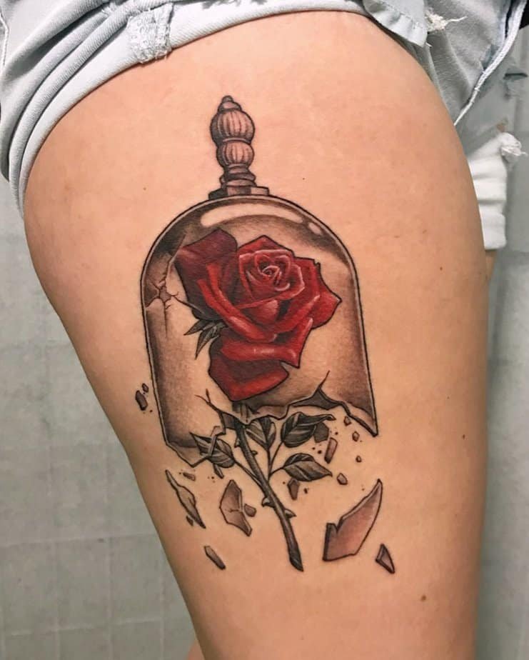 Dotwork and shattered glass make this one feel cinematic: the dome breaking, shards falling, the rose finally free. The red petals read like an exclamation—love is powerful, and true beauty really does come from within.