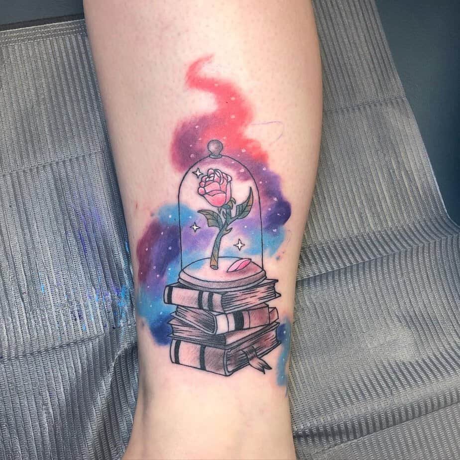This forearm piece—rose trapped under a dome, petals drifting down—hits you right in the feels. It’s the literal countdown from the story, sure, but it’s also about consequence and redemption: the Beast’s curse wasn’t random, it was a lesson. Wearing this kind of tattoo is like carrying a reminder that our choices matter, and that change is always possible.