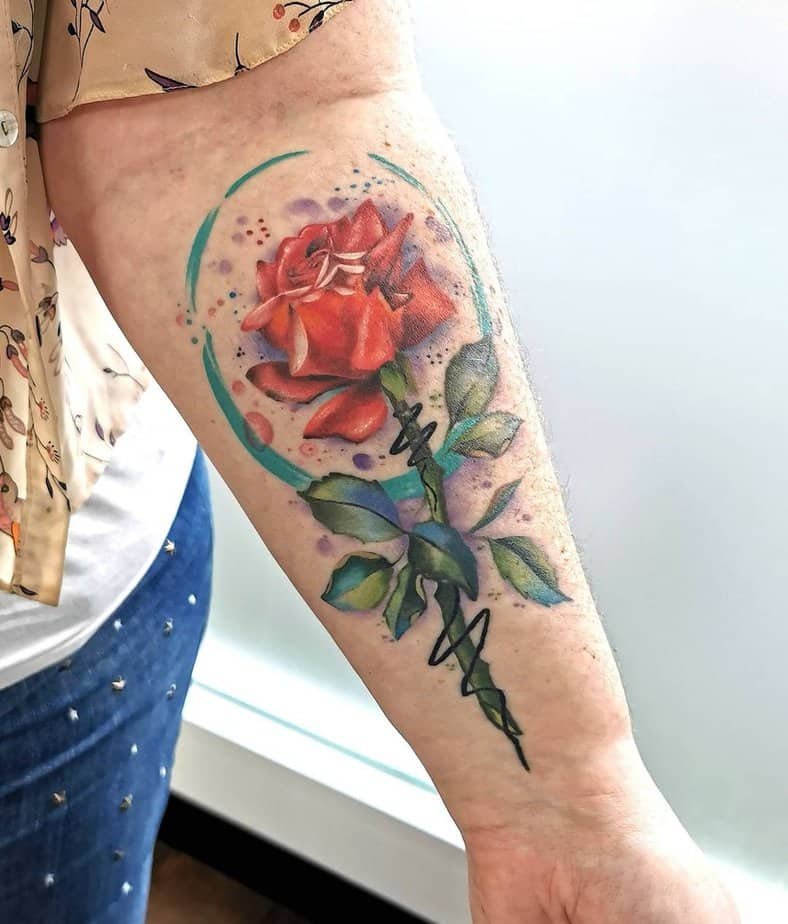 This half-sleeve nails the drama with a rose in a dome rendered in bright, lush color. Beyond the wow factor, it’s one of those pieces that asks you to look inward: what parts of yourself need tending? The rose becomes a symbol of self-reflection and the idea that real magic shows up when you work on becoming better.