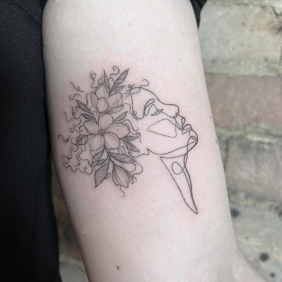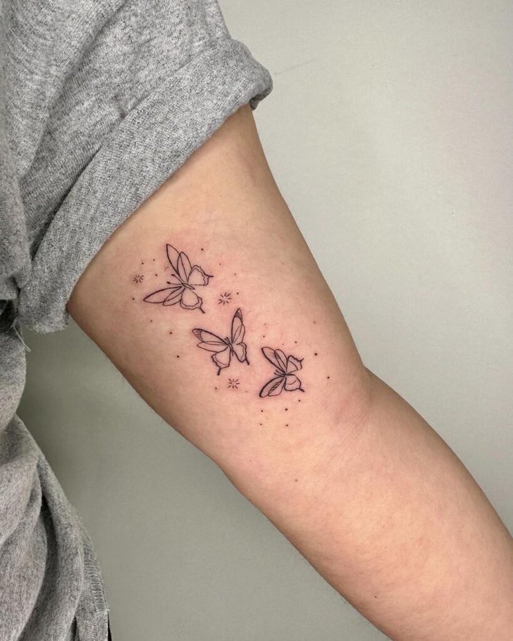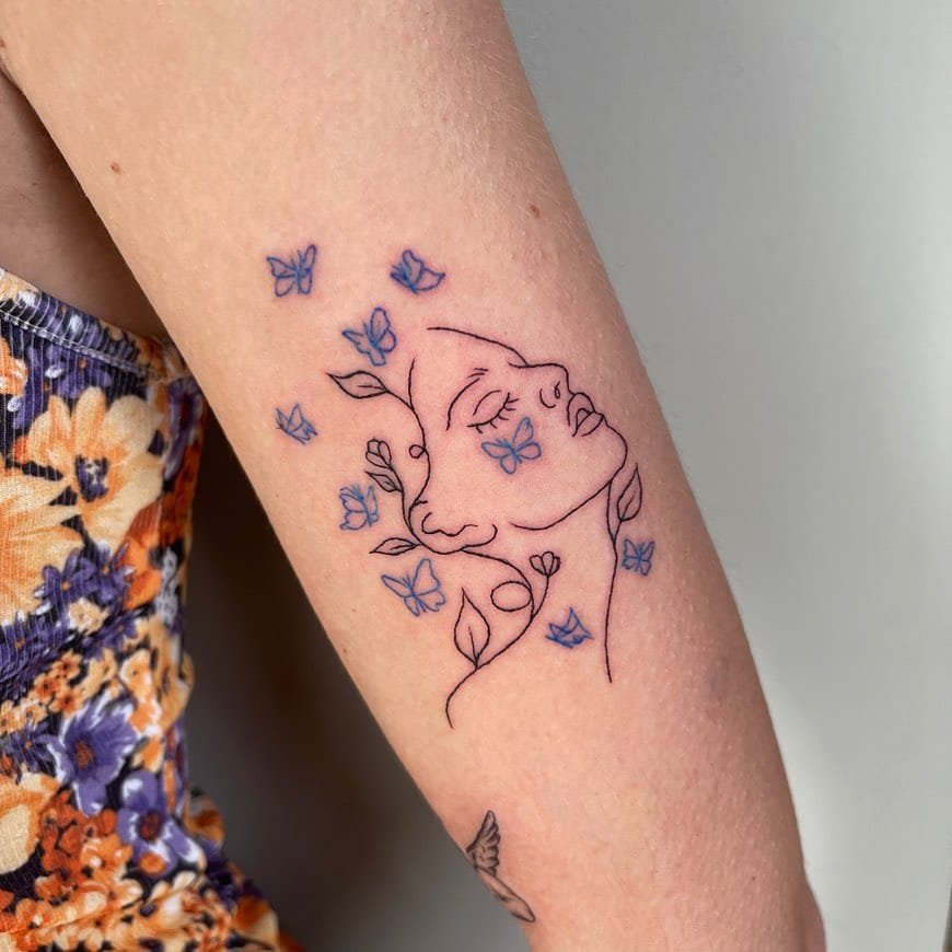 Outline tattoos that trace faces or shapes are quietly striking. Add a few colored butterflies and you’ve got contrast and movement without going loud.