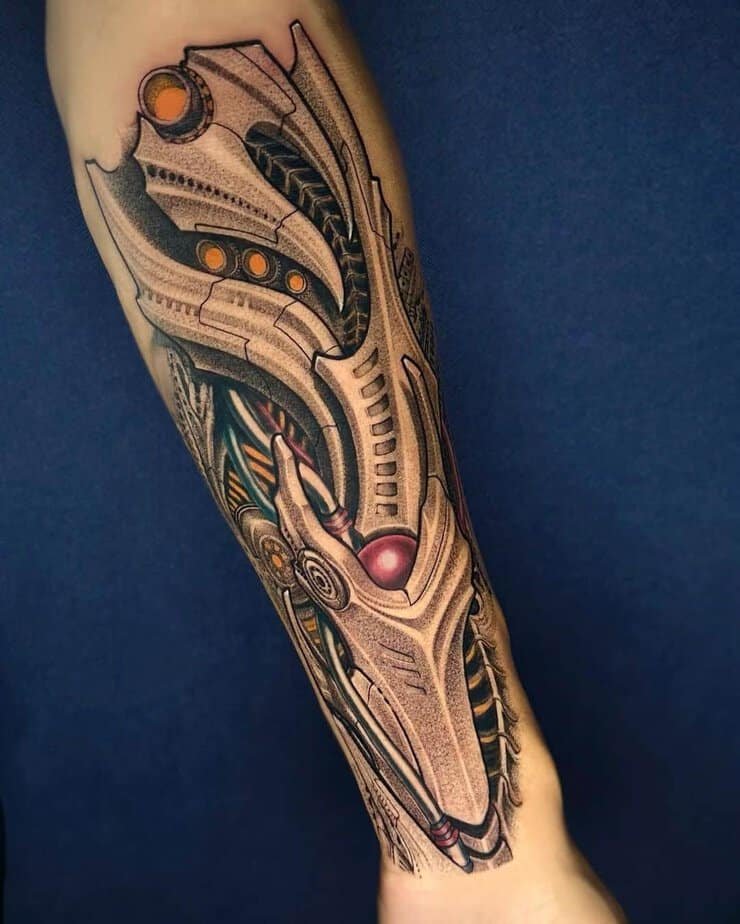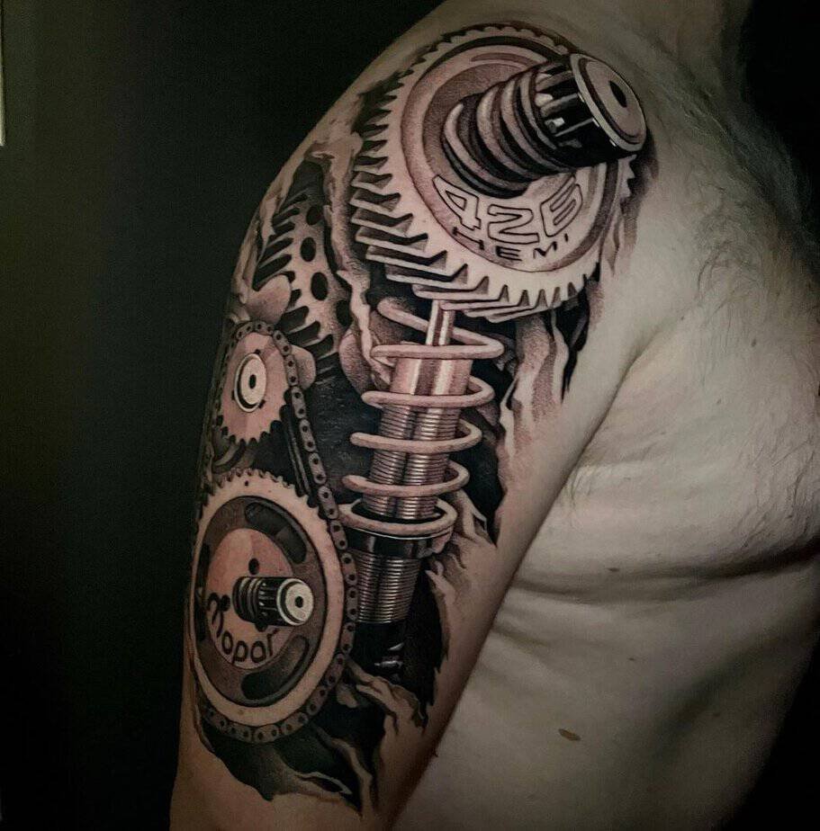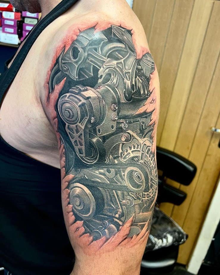 If you don’t want a forearm or bicep piece, shoulder tattoos that flow down the arm or across the chest are gorgeous. Some of these feel almost hypnotic — so many machines, pipes, and shadows that you can get lost staring at them. The rips in the skin still give you that bio element, but the scale lets the machinery breathe.