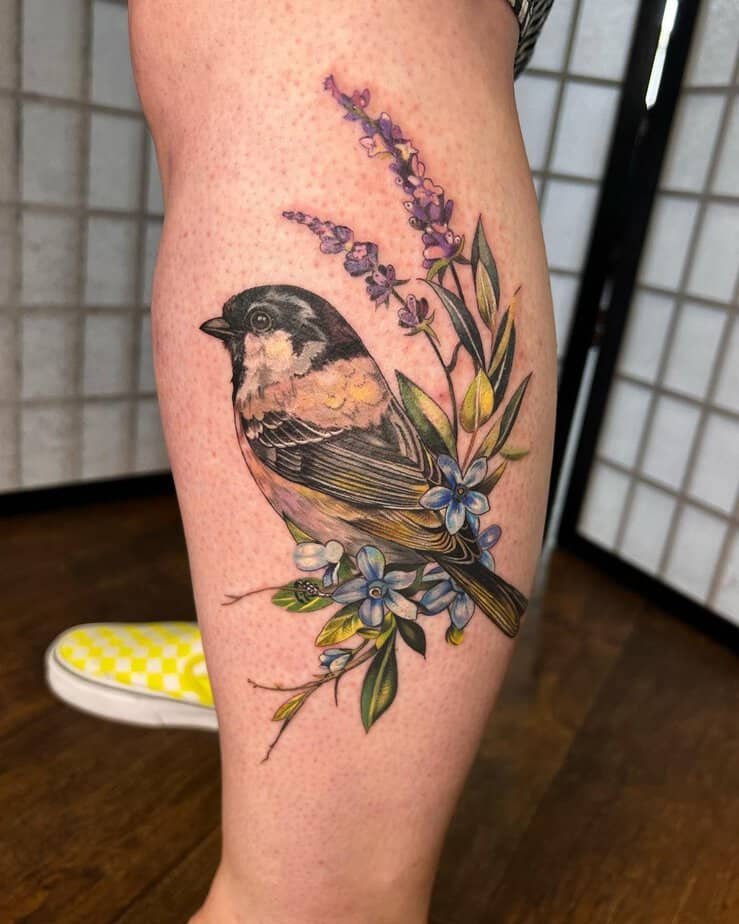 If you want something that packs a punch, this small bird perched on a branch in traditional colors (greens, oranges, yellows) is a great shout. Placed on the shin, it’s cheeky and daring — like a tiny emblem of confidence.