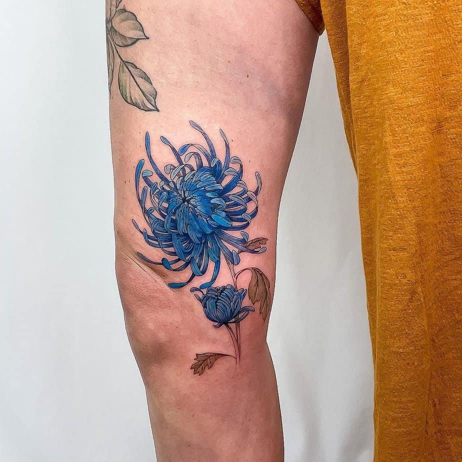 If you want something that turns heads, a blue butterfly on the knee is playfully bold. The dotwork makes it feel almost like a watercolor dream, and the symbolism — transformation and new chapters — fits so well if you’re in a season of change. It’s whimsical but also quietly meaningful.