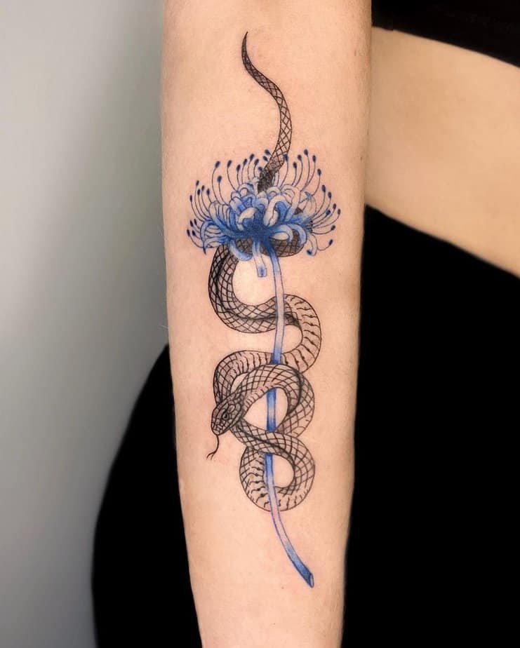 Snakes are complex symbols — danger, sure, but also transformation. Paired with a spider lily, this combo reads like shedding what no longer fits and stepping into renewal. It’s moody, beautiful, and carrying a lot of emotional weight.
