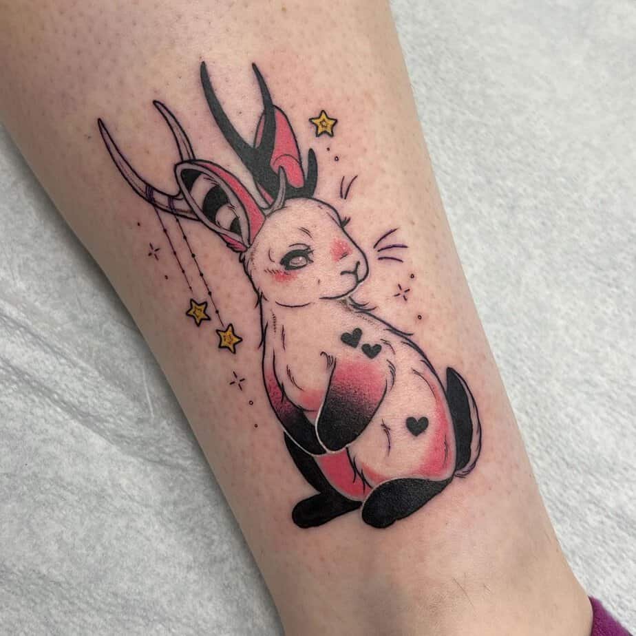Okay, first off — a jackalope. Mythical, slightly wild, and absolutely darling. Picture a jackrabbit with antlers, little stars twinkling around those horns, and tiny heart details stitched into its fur. The soft pink and black color palette gives it this dreamy, fairytale energy. It’s cute and mysterious at once, perfect if you want ink that feels like a secret you can wear.