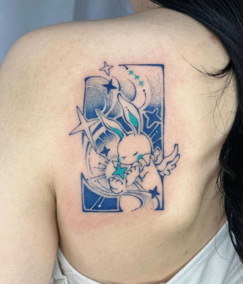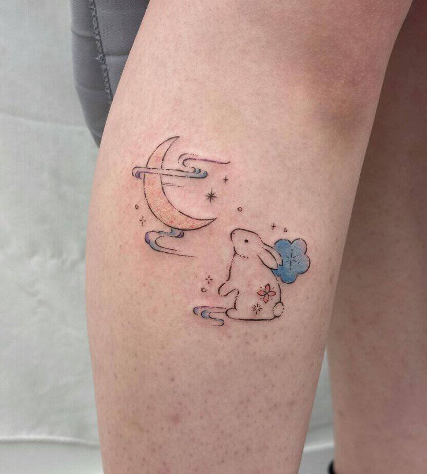 A bunny gazing at the moon with a little flower tucked behind its ear — this one is the very definition of tranquil. Gentle lines, soft colors, and tiny stars make it feel like a small night scene captured on skin. Perfect for dreamers.