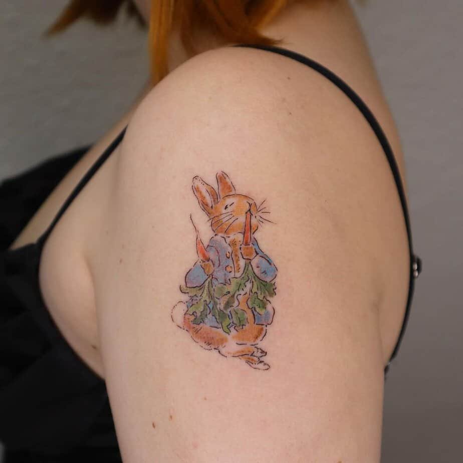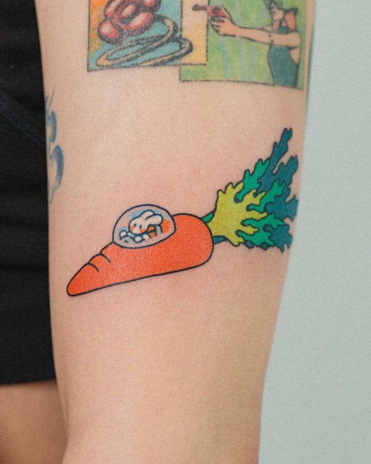 If you like your tattoos with a side of whimsy, this is the one. A determined little bunny blasting off in a carrot-shaped rocket — colorful, quirky, and totally delightful. It’s the kind of piece that makes you smile every time you catch a glimpse.