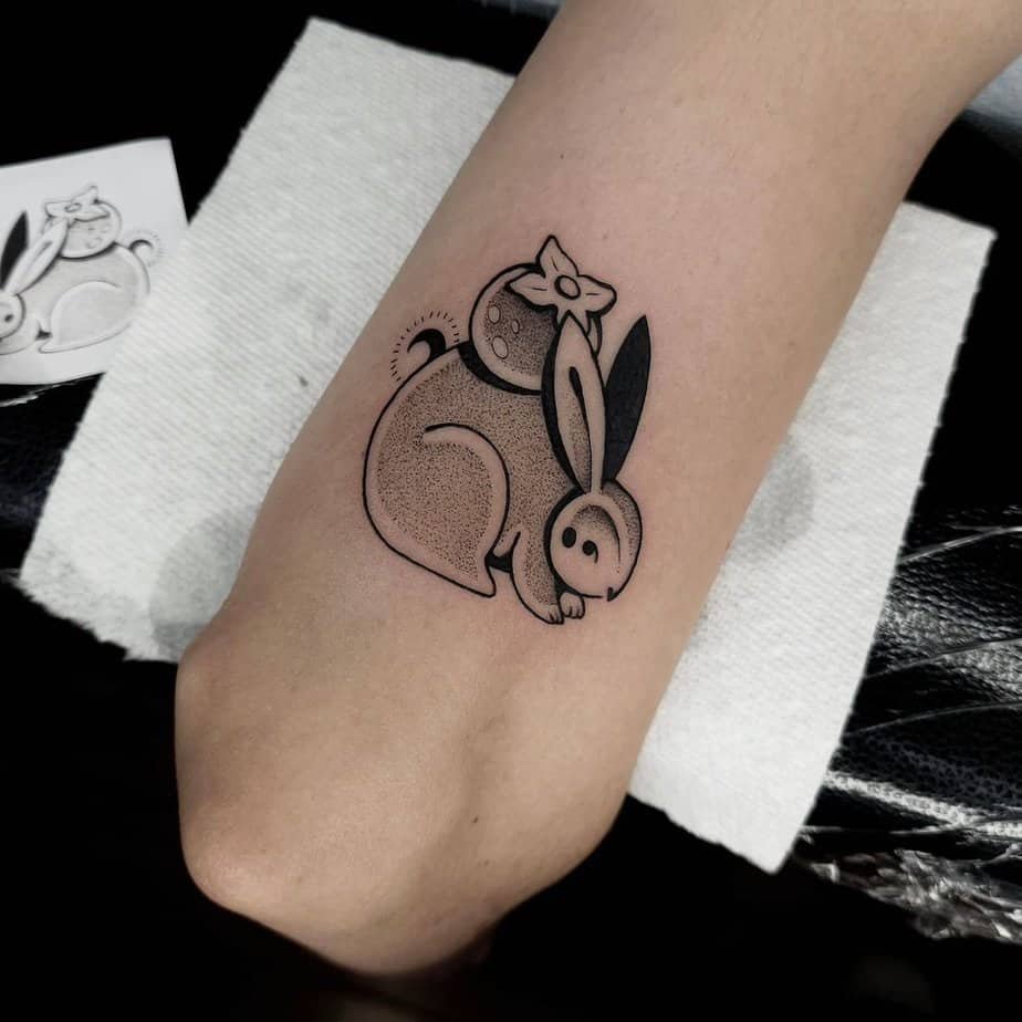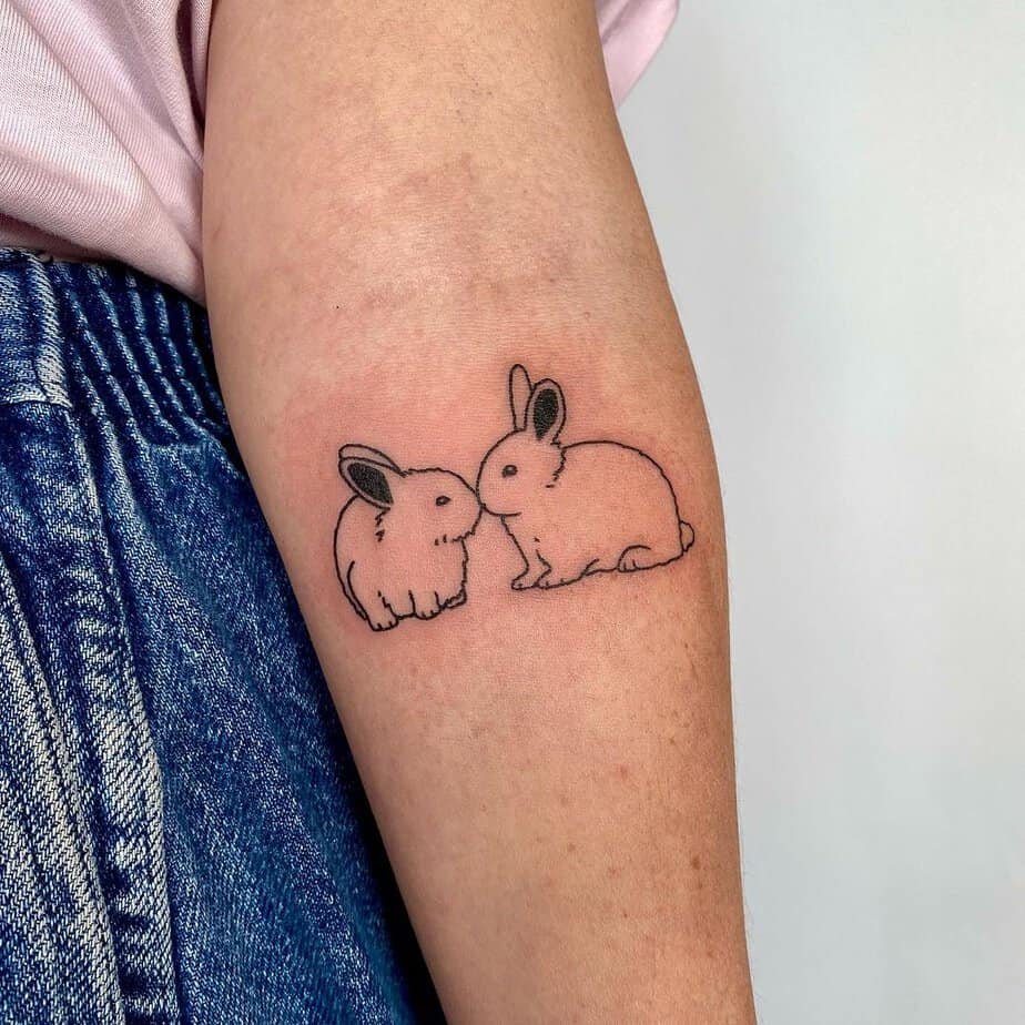 Two little bunnies nose-to-nose, drawn with minimal black ink — this one is understated and pure. No fuss, just a soft moment captured on skin. If you want something low-key but meaningful, this minimal pairing is a lovely choice.