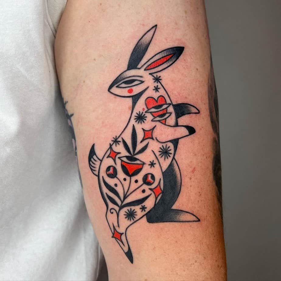 Sometimes the sweetest tattoos are the simplest ideas executed well — like a ring of tiny bunnies connected by a red string that forms a heart. Each little bunny looks playful and joyful, so the whole thing reads like a wearable love letter. Cute, sentimental, and absolutely adorable.