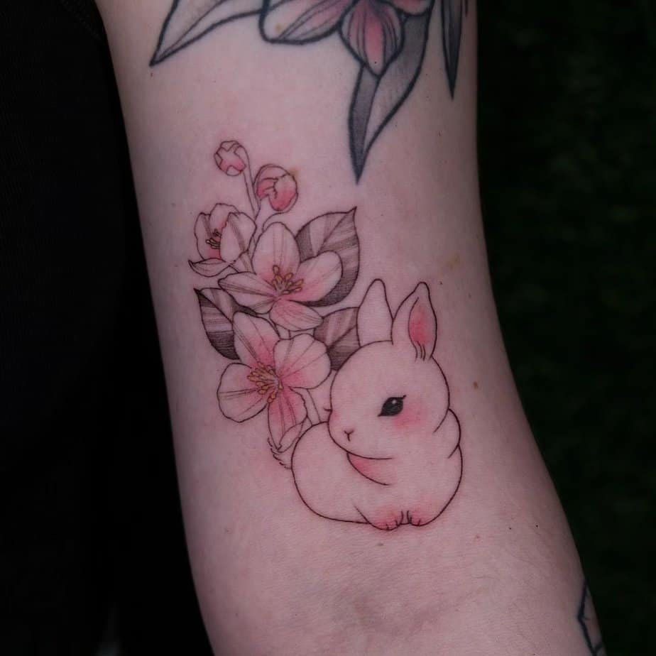 A bunny with a strawberry hat surrounded by colorful flowers — this one is pure joy. Big eyes, playful colors, and a happy expression make it feel like a page from a picture book. If you want your tattoo to be sunshine in ink form, this fits the bill.