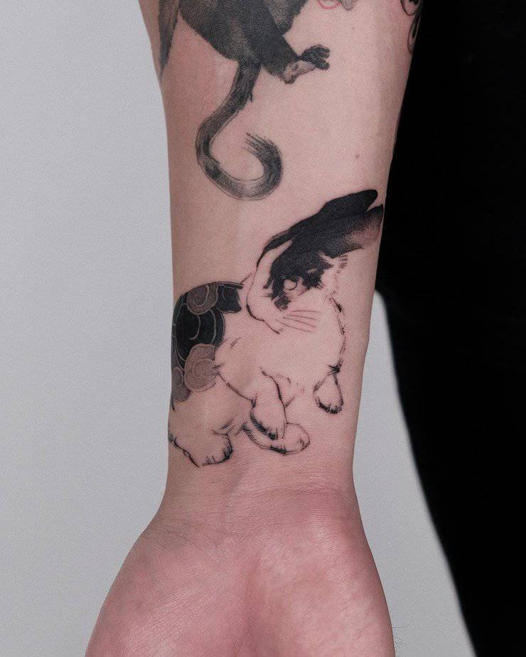 This piece blends a bunny’s sweetness with traditional Japanese patterns — think waves and clouds worked into the rabbit’s form in black and gray. It’s elegant and refined, and the detailed shading makes it feel like a classic woodblock print given new life.