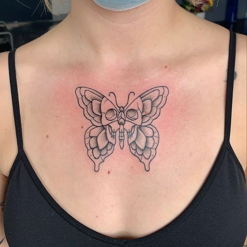 Fine-line work never really goes out of style because it’s so neat and refined. This example mixes a butterfly with a skull in a delicate way — a little unexpected, but somehow it works beautifully.