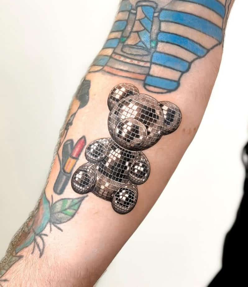 Teddy bear as a disco ball? Yes, please. This forearm piece is sweet and glamorous at once, cute but with a realistic metallic sheen that kind of makes me smile every time I see it. It’s playful without being juvenile — pure joy with an edge.