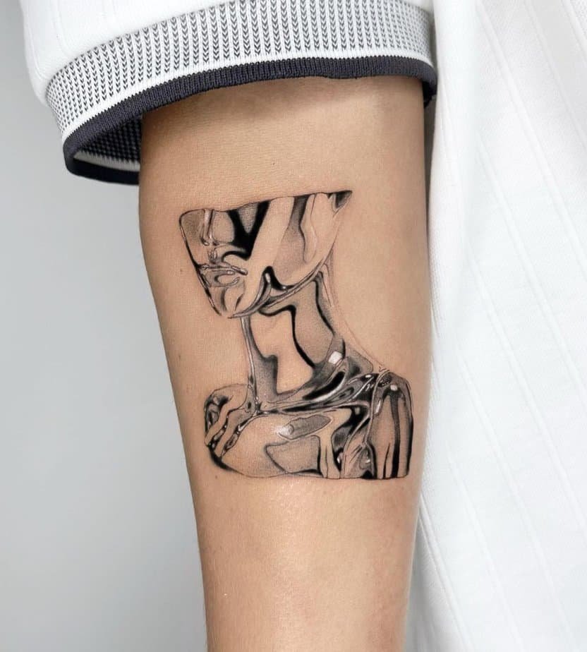 Okay, picture this: a forearm tattoo with a chrome face and upper body done in dramatic black and gray. It catches light in this unexpected way, and honestly, it’s the kind of piece that turns heads without being loud. It also gives your whole vibe an intriguing edge — like you’re quietly radiant and a little mysterious.