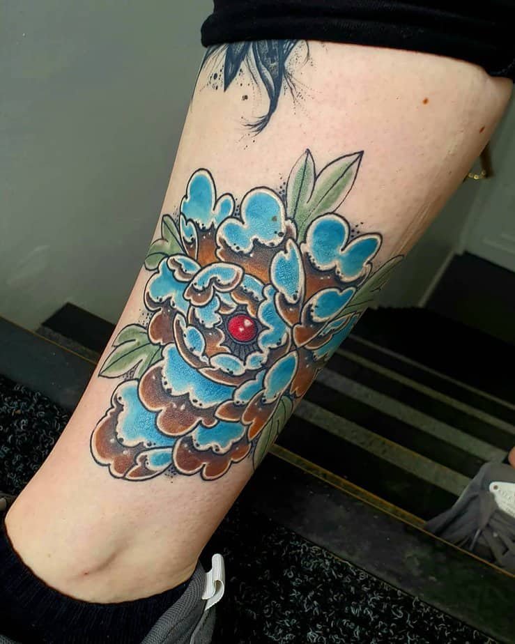 Big peony blooms in blue and brown on the shin are a daring, romantic pick. Peonies are all about true love and devotion, and in chrome they feel both traditional and fresh — dramatic placement, timeless meaning.