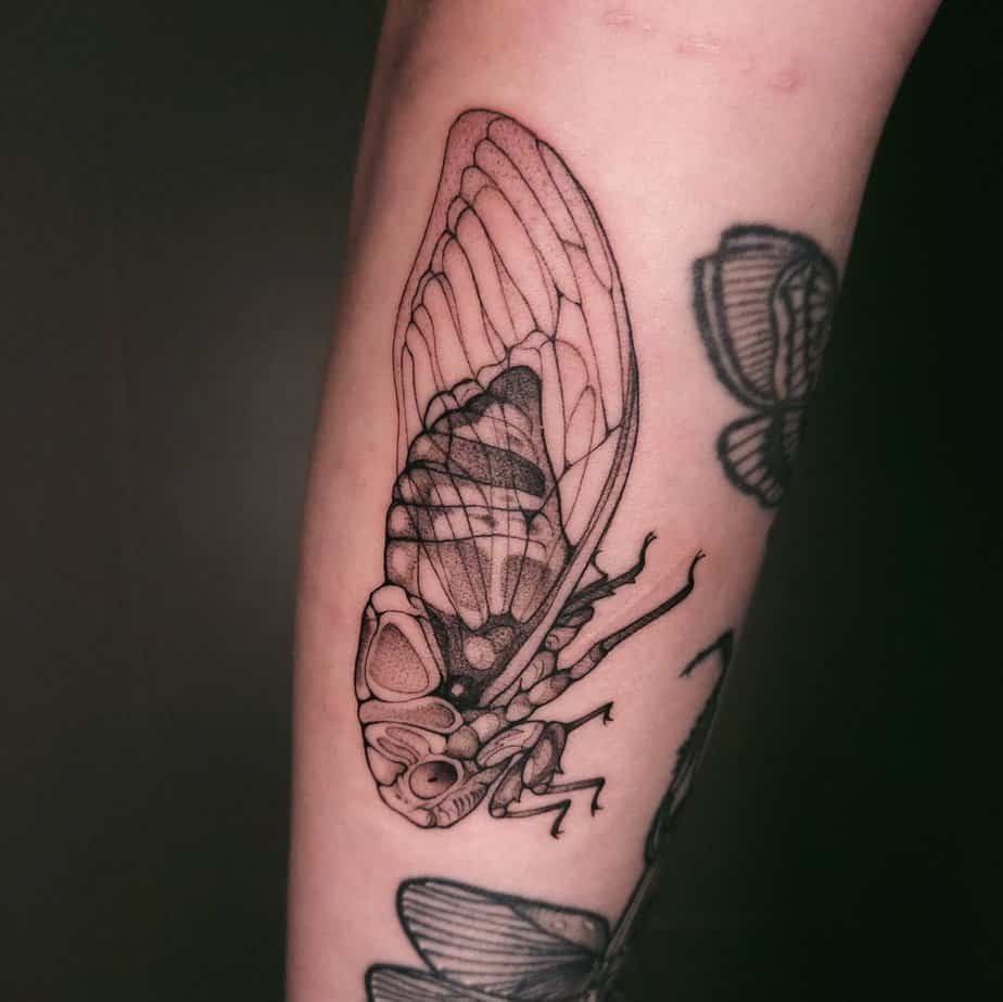 Dotwork is one of those tattoo styles that feels like craftsmanship. Each little dot builds texture and shadow so the cicada looks layered and alive. If you appreciate meticulous detail and something a bit tactile-looking, this dotwork approach is a dream.