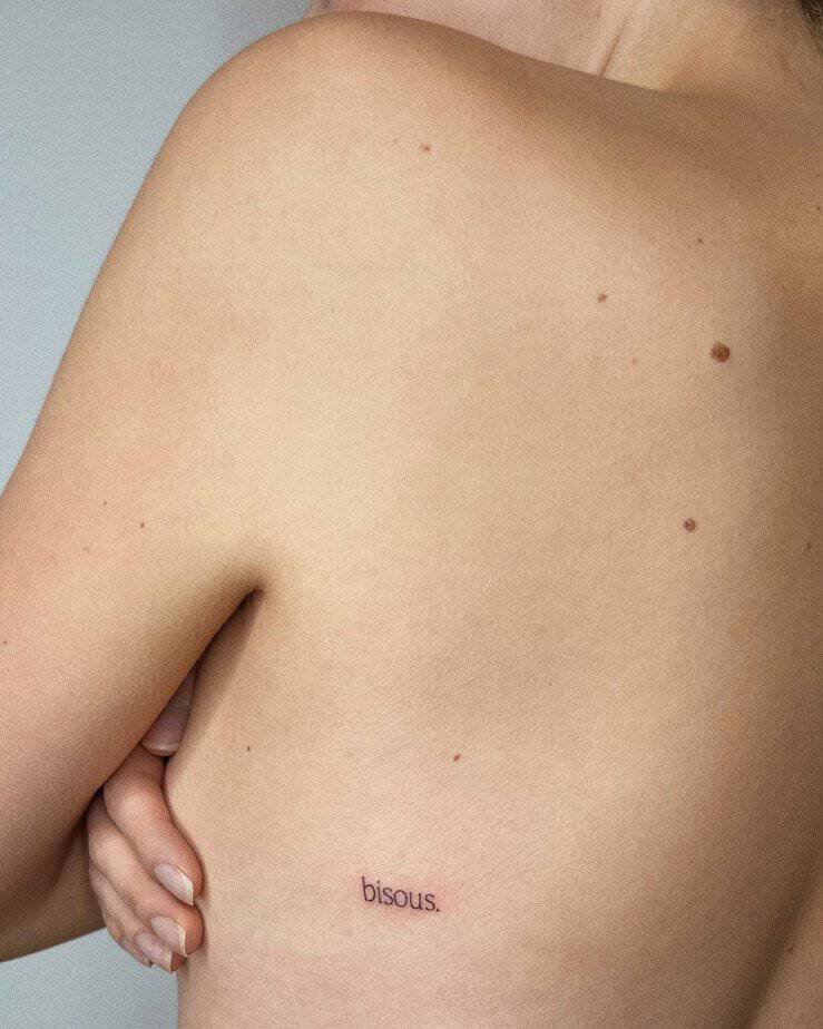 Word tats on the back are a low-key way to send a message — to the world or to yourself. “Bisous” is playful and sweet, and a small script tattoo like that sits on your skin like a private postcard. Perfect if you want something readable but not shouty.