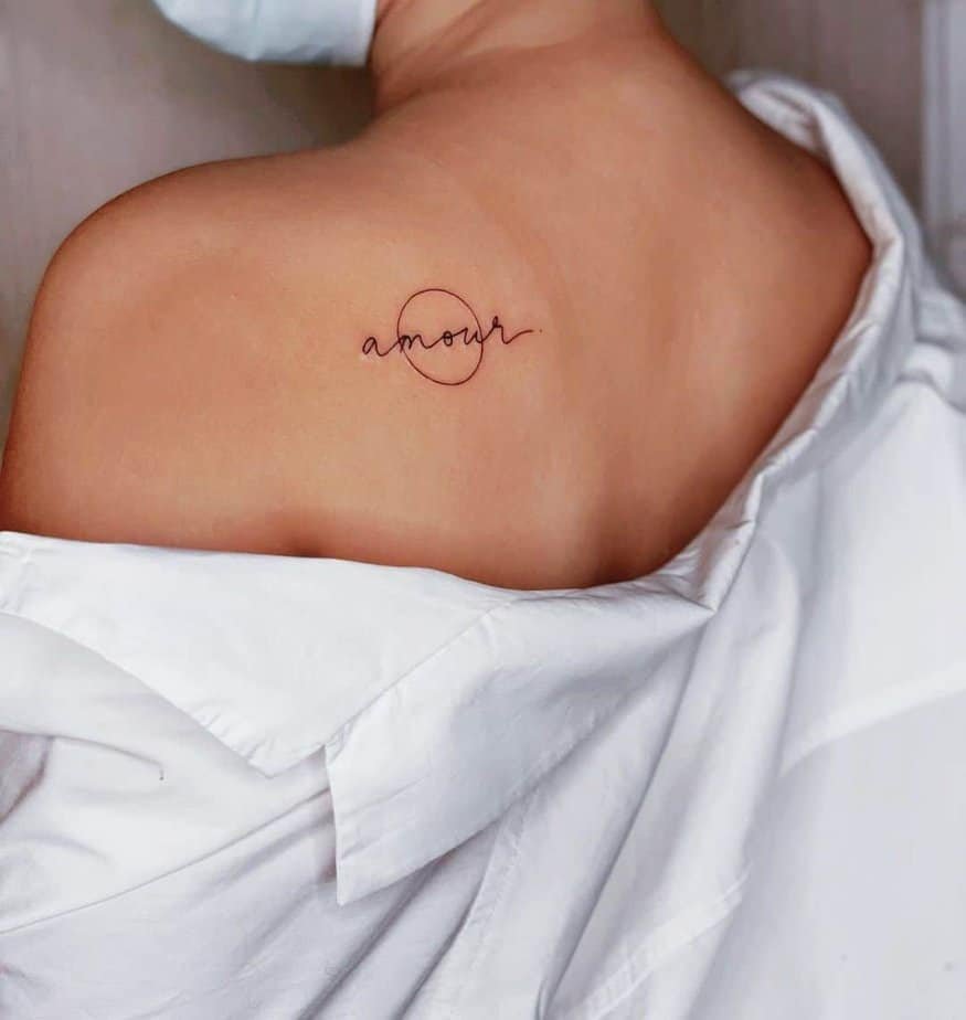 Word tattoos are flexible — you can play with languages, scripts, or styles. “Amour” is romantic and classic, and it feels a little mysterious when tucked on your back, like a private poem.
