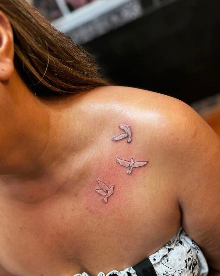 Three tiny doves following each other along the collarbone — delicate outlines filled with white ink — they feel hopeful and steady. Perfect if you want something subtle that still whispers courage and intention.