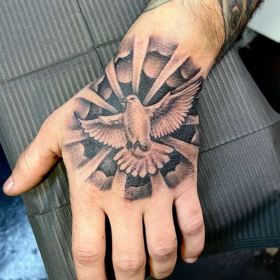A small dove inked on the hand with rays of light behind it — compact but luminous. It’s a wearable reminder to choose empathy and understanding in day-to-day choices.