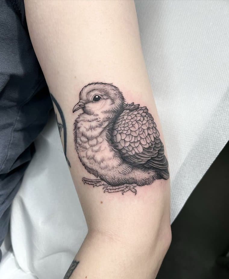 Beautiful shading and crisp linework make this black-and-gray dove feel almost three-dimensional. It’s the kind of design that nods to divine will and quietly says, ‘‘there’s a reason for this, and you’ll get through it.’’