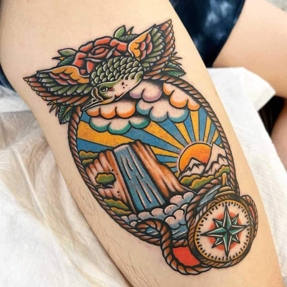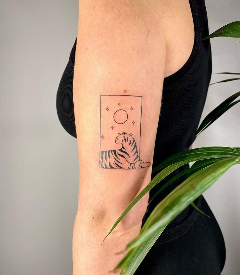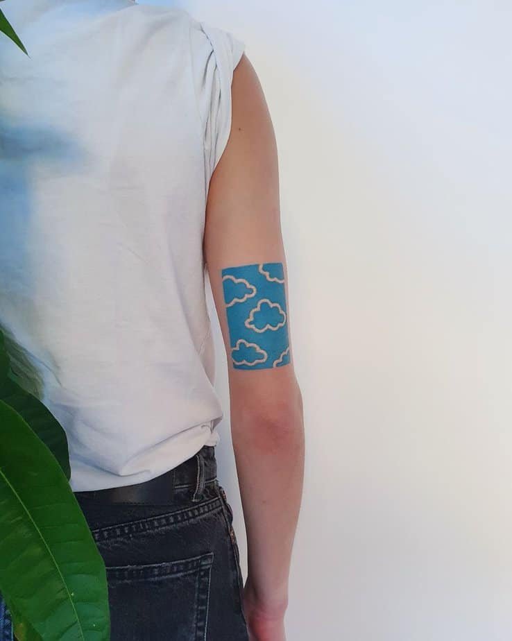 This upper arm piece is quiet and calming: a framed sky done with handpoked technique that gives it a textured, intimate feel. It’s simple but evocative — the kind of tattoo that makes you take a deep breath when you glance at it.