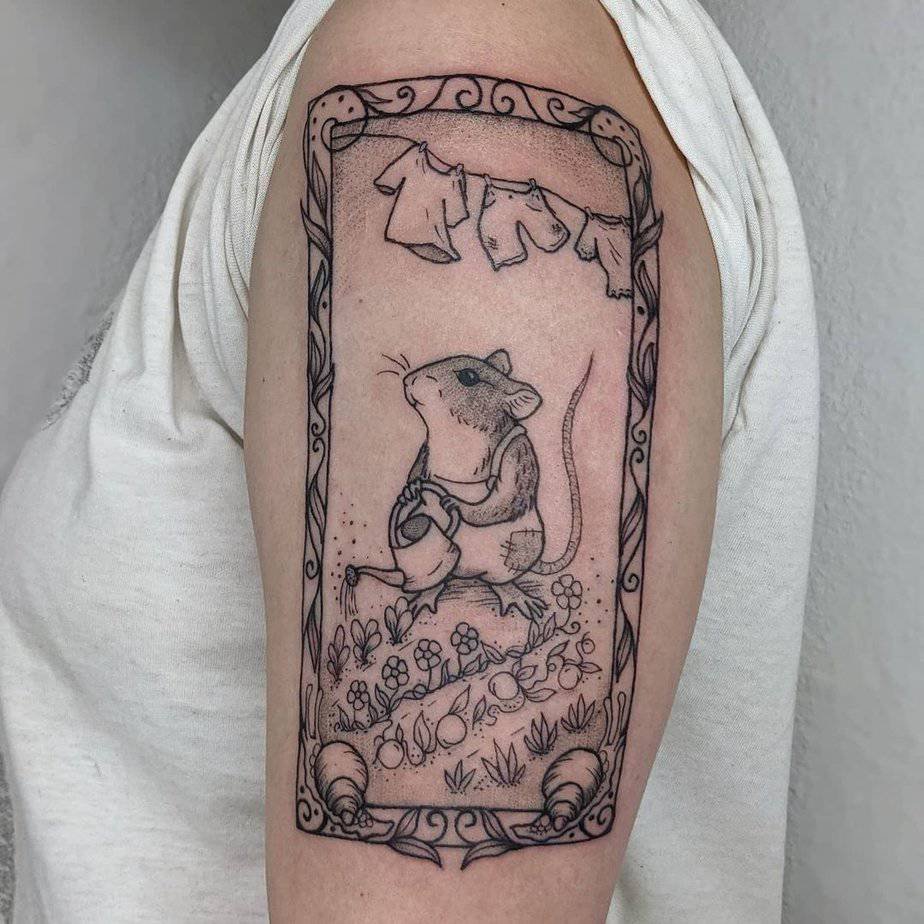 Okay, this one is honestly adorable: a little mouse on the upper arm, watering its flower garden while wearing the cutest tiny clothes. It feels like a page ripped from a children’s book, and the symbolism is sweet — mice standing in for joy and curiosity, nudging you to notice the small wonders around you. The black-and-gray shading and detailed dotwork give it depth so it reads like a tiny, lived-in world on your skin.