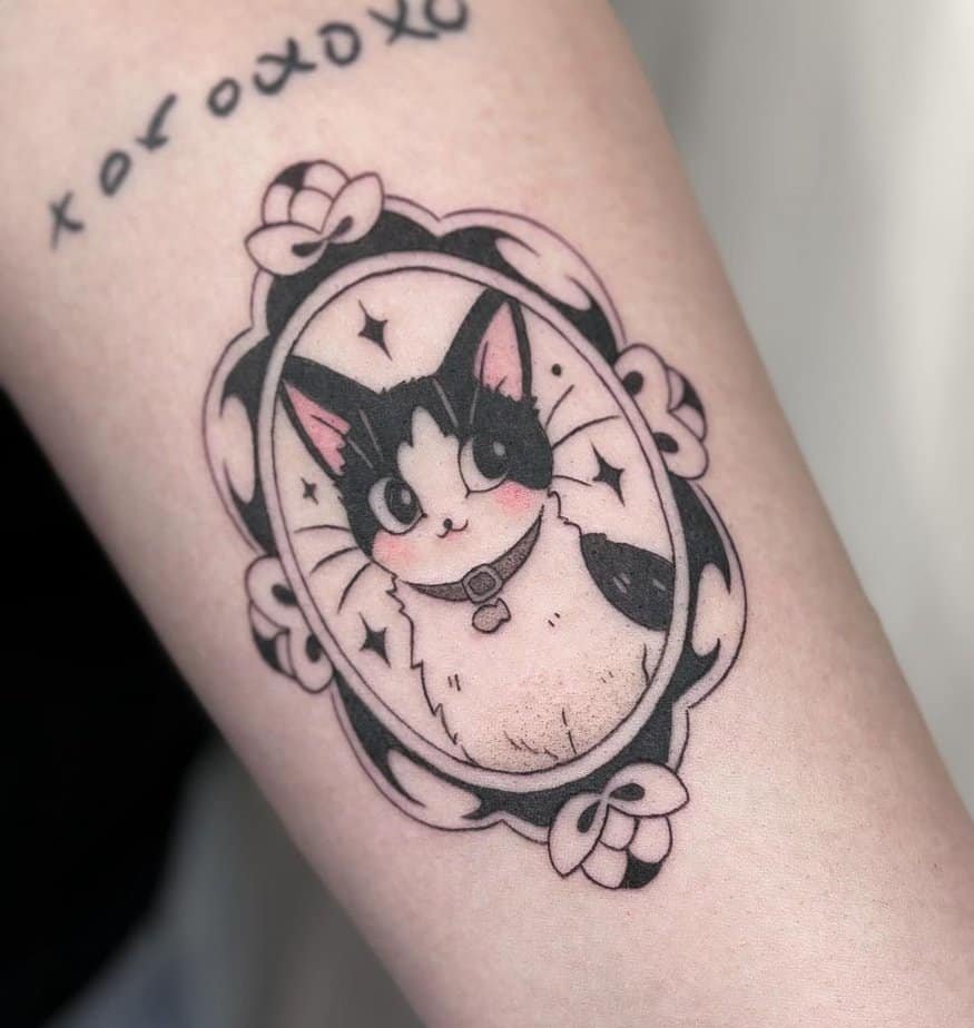 This framed cat is simple and soft — mostly blackwork with a little pink to add that tender touch. It’s a lovely way to show love for a pet or just your general cat energy. The meaning? Independence and quiet strength — a reminder to trust your instincts and own your space.