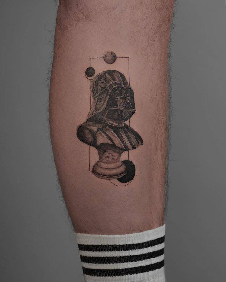 Calling all Star Wars obsessives: this Vader piece uses dotwork and black-and-gray shading to capture his vibe perfectly. Placed on the calf, it’s bold and iconic — a loving nod to a character that’s left its mark on pop culture (and our hearts).
