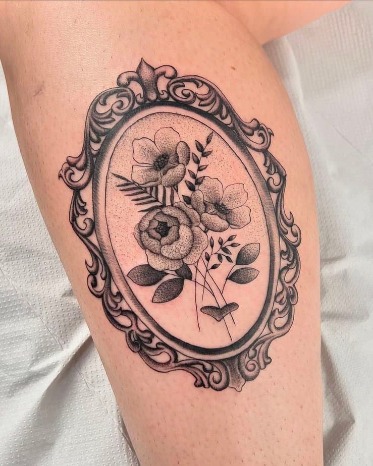 This floral bouquet framed up feels like a gift you can wear. The frame amps up the composition, and the mix of black-and-gray with dotwork makes the whole thing dramatic and romantic. Whether it’s for someone special or just because you love flowers, it’s a sweet, timeless choice.