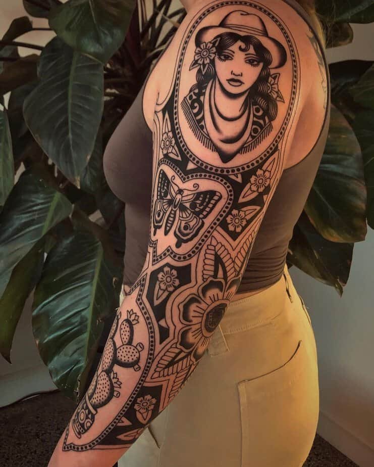 If you want something bold, a framed sleeve gives you so much room to play. This one mixes a cowgirl, butterflies, and flowers — all the symbols of growth, beauty, and transformation. Done in strong blackwork, it reads like a visual diary: change is part of the journey, and staying still too long isn’t the vibe.
