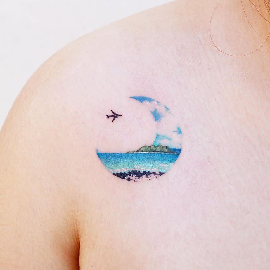 I love this collarbone piece — the ocean and surrounding nature shaped into a crescent moon. There’s even a tiny airplane flying above, which contrasts civilization with the peaceful solitude the sea represents. The plane breaking the frame adds a nice narrative twist, and the calming blues make it feel quietly restorative.
