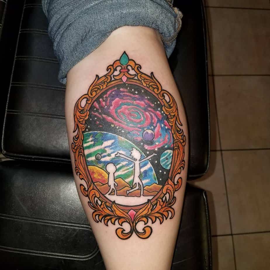 For a loud, colorful statement, this Rick and Morty calf piece captures their wild adventures with bright pops of color and the characters in striking white. It’s playful, chaotic, and perfect if you want a tattoo that shows you don’t take everything too seriously.