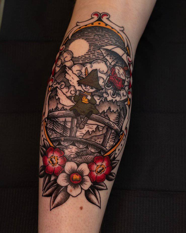 Moomin fans will adore this Snufkin piece. He’s the free spirit of the series, and the tattoo pairs his colorful figure with nature in black and gray — a nice contrast that celebrates individuality, quiet wanderlust, and the philosophy of finding your own way.