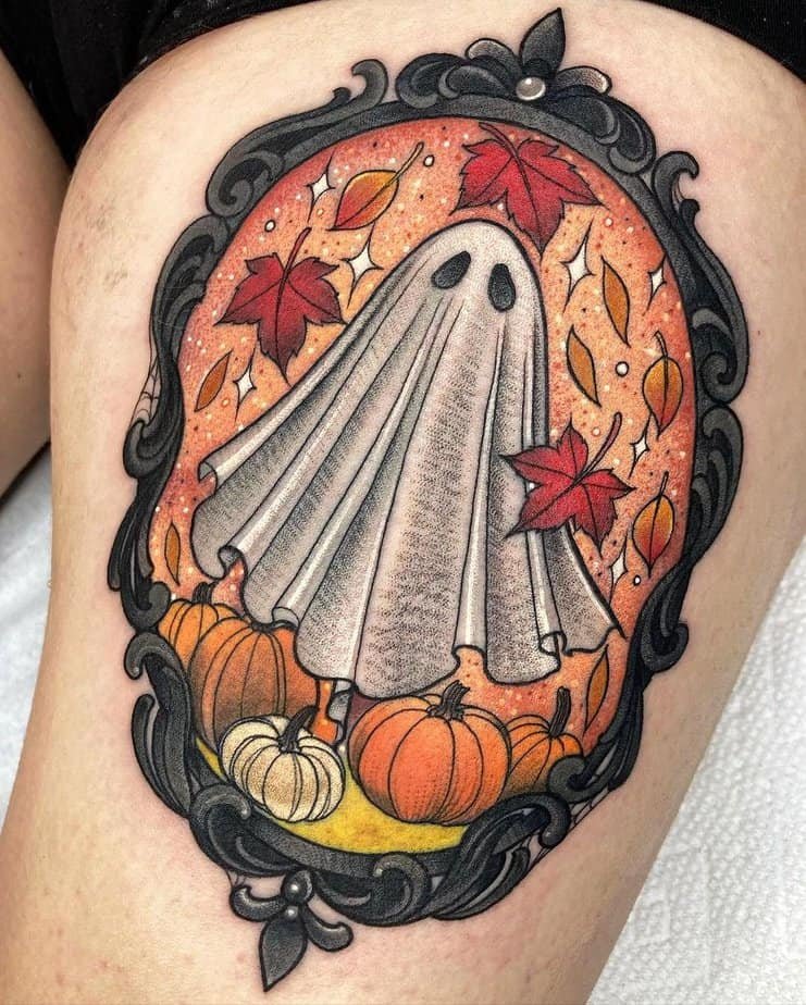 If you live for October vibes, this framed ghost with pumpkins and autumn leaves is such a fun pick. The warm oranges bring that cozy spooky energy, and the thigh placement keeps it playful — hidden when you want, party-ready when you don’t.