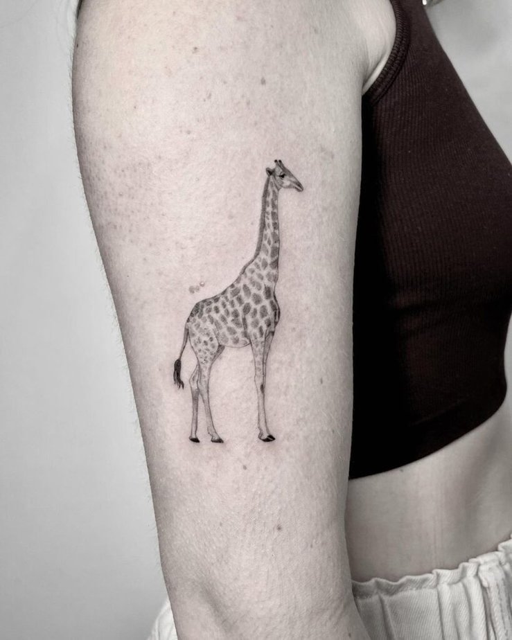 Not into bold pieces? A micro black giraffe on the shin is quietly charming. It won’t scream for attention, but it’ll always be there when you need a little reminder of gentleness and humility. Small tattoos can carry big meaning — this one proves it.