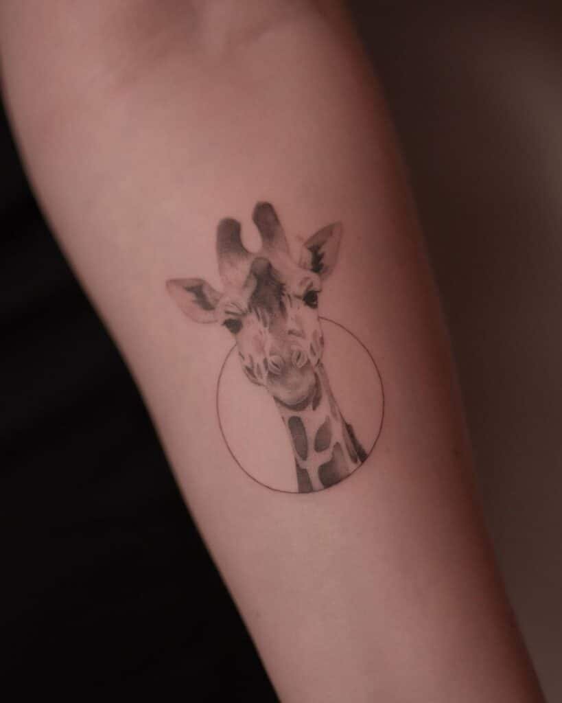 A giraffe wrapped in flowers — can you picture anything more soft? This one leans into femininity and grace, amplified by blooms that hug the animal’s shape. If you’re ready to celebrate tenderness and let that delicate side show, this is a lovely, wearable option on the forearm where you can see it every day.