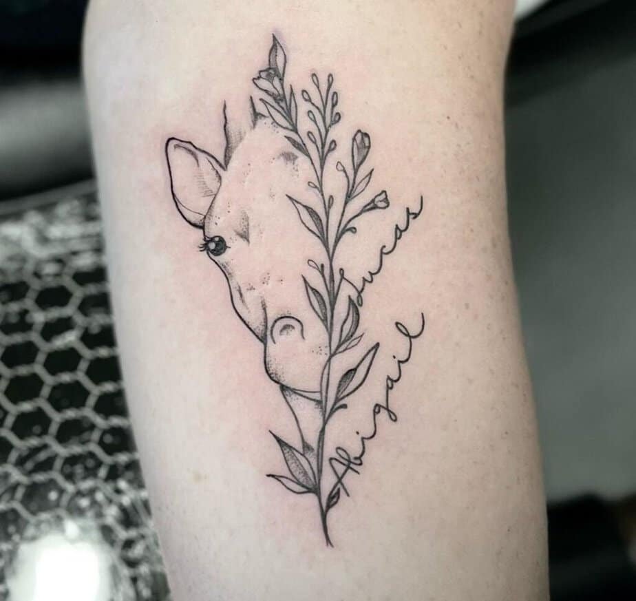 When you combine a giraffe with floral elements, you get this elegant blackwork piece that feels both delicate and strong. It’s like two metaphors folded into one image — grace meets presence — perfect for the leg if you want something with a flowy, organic feel.