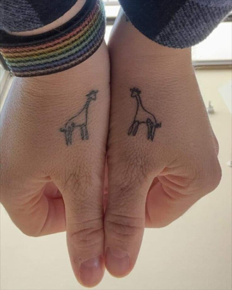 Okay, hear me out: two identical little giraffes inked on opposite sides so they face each other when you’re together. It’s tender and kind of poetic. If someone you love is far away, or if you’re trying to close an emotional distance, this could be a gentle nudge — a small, wearable way to say “you matter” even when words are hard.
