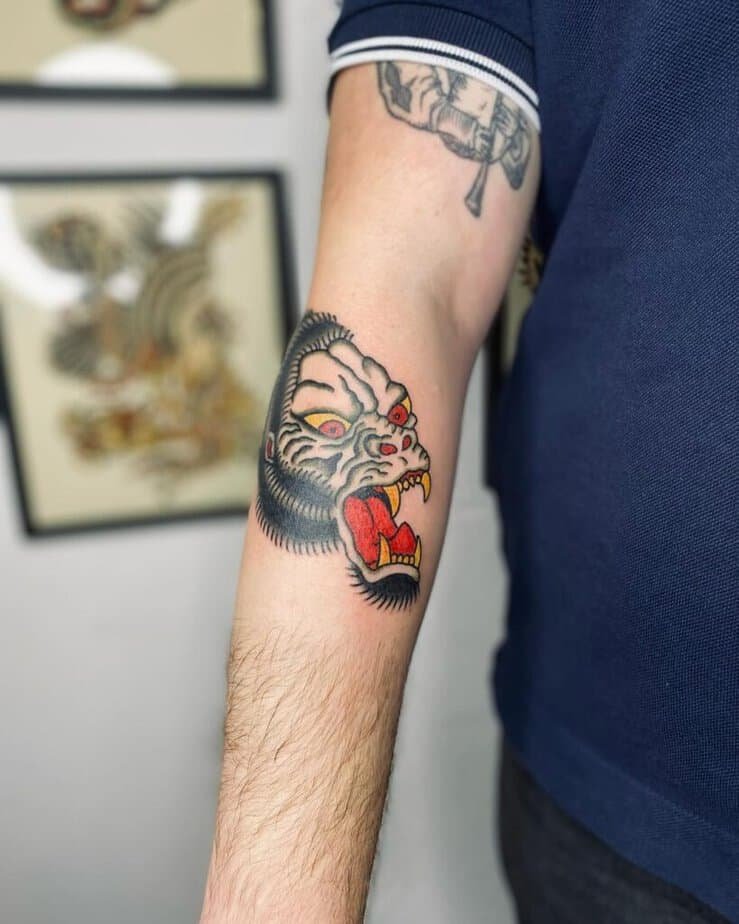 Traditional tattoos are loud in the best way — big outlines, saturated colors, zero subtlety. This one’s a black gorilla head with flashes of red and yellow that just demand attention. If you like your ink to announce itself when you lift your sleeve, this is your vibe.