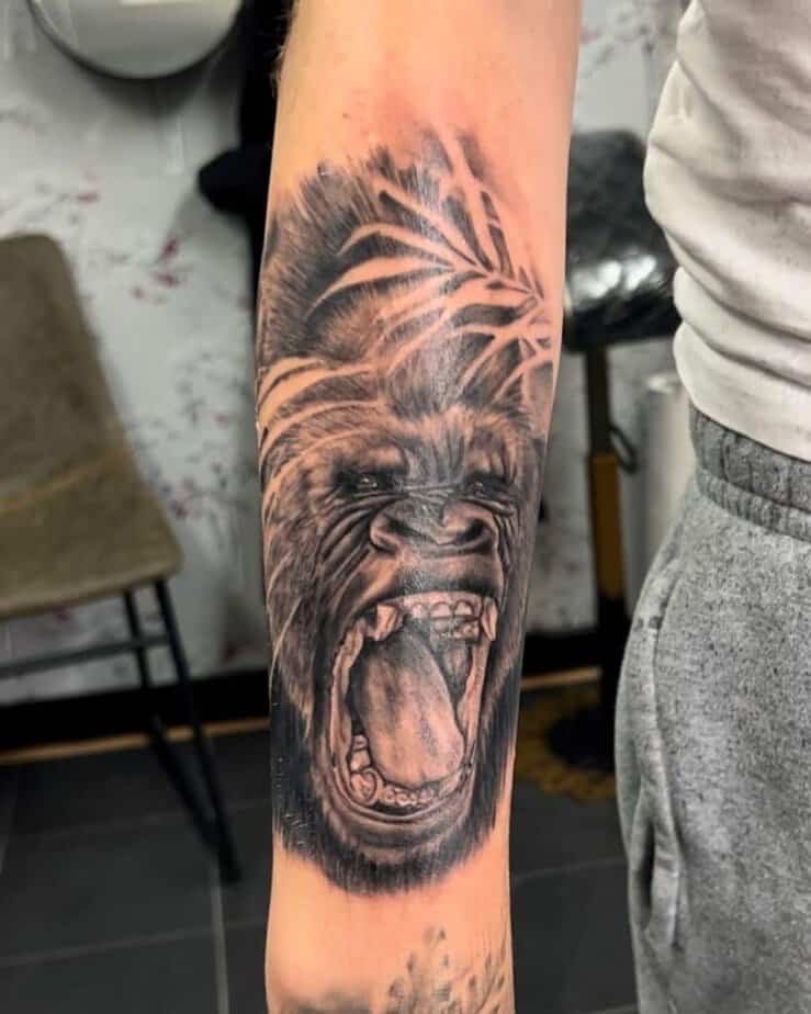 A full sleeve lets the gorilla live with other motifs — tigers, leaves, and filler that make the whole thing feel cohesive. If you want a narrative or a themed look, sleeves are where artists can go wild and tell a visual story.