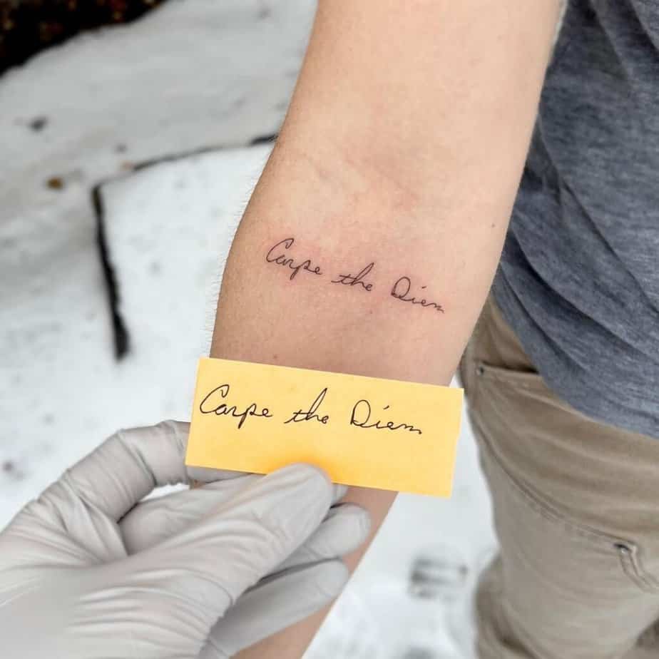 Phrases that spark memory make gorgeous tattoos. Whether it’s a line from someone you love or your own little mantra, handwriting brings that nostalgic warmth and lets you play with placement and tiny embellishments.