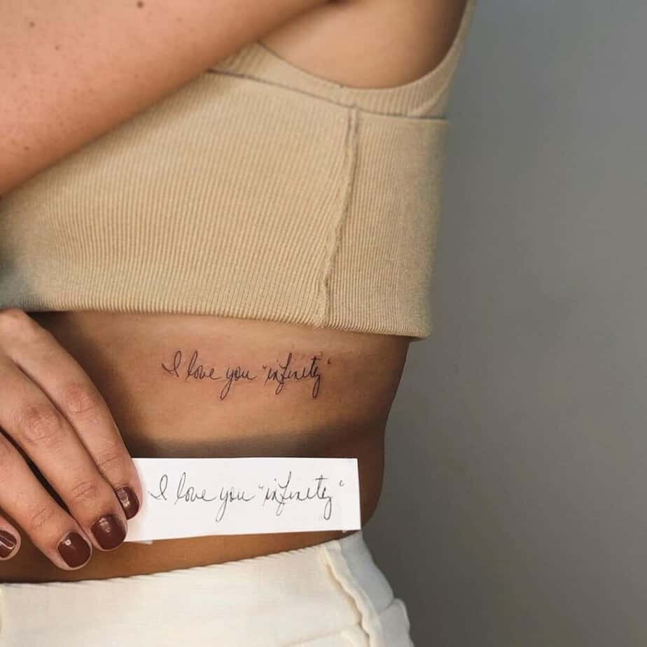 Ribcage tattoos are intimate by nature. A small handwritten reminder there — something like "you are loved" — becomes a private ritual. It’s for the moments you need to tuck yourself in with kind words only you know are there.