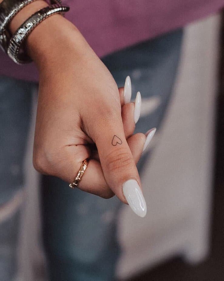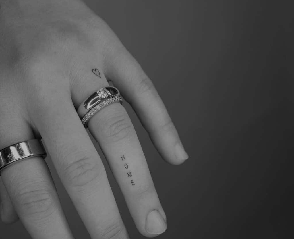 Finger tattoos are endlessly charming and pair so nicely with a wedding ring or stacking rings. A tiny heart on your finger gives you that constant little nudge of love — for your partner, your journey, or even just because.