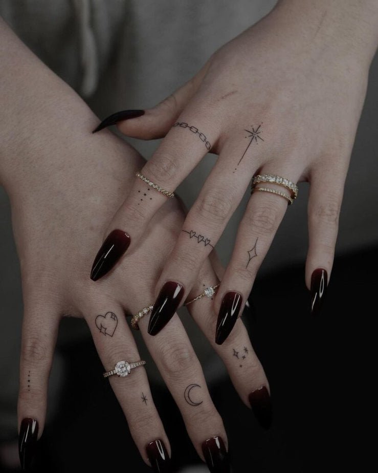 You can’t go wrong with a sparkly heart — it’s playful and feels celebratory. Whether it’s your first finger tattoo or one more tiny treasure among others, a heart with sparkles is a cute way to add personality.