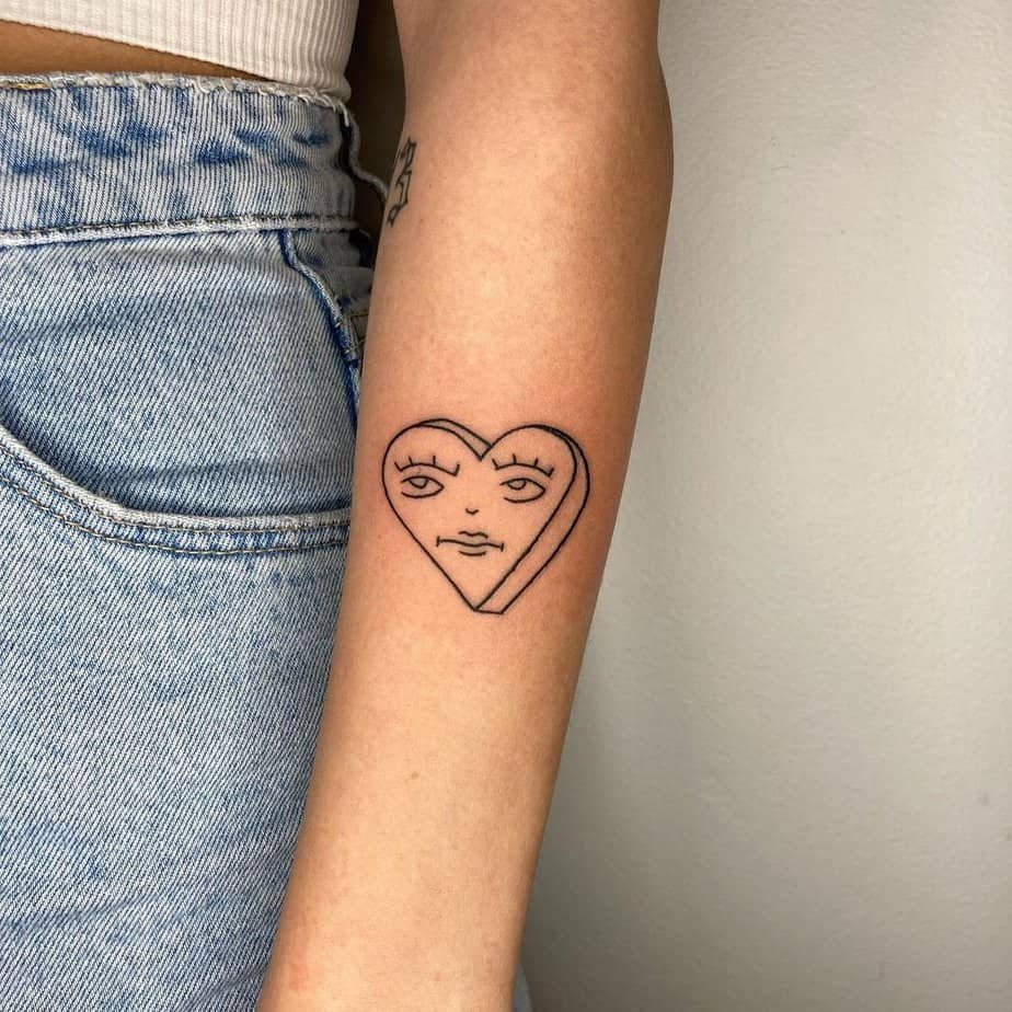 A forearm heart with a slightly sad face — it’s cute and a little bittersweet, reminiscent of the candy hearts with messages we’d give on Valentine’s Day. It’s a tiny, honest reminder that love can be messy and not every story is a rom-com. Also, you could totally flip it into a smile if you wanted a happier vibe.