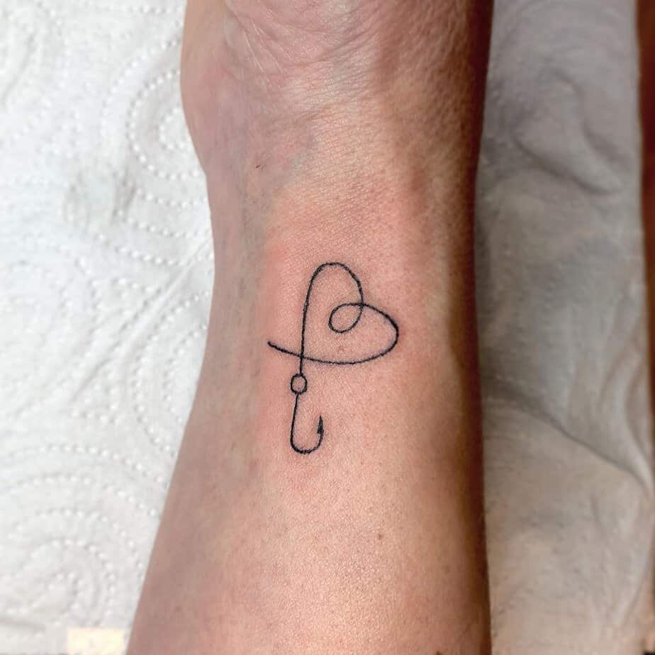 This one looks like a tangled thread finishing in a little hook — charming and a touch whimsical. It could mean the sea, a love for fishing, or something more symbolic like holding on to memories. It reads handcrafted and personal, like a tiny story stitched on your skin.