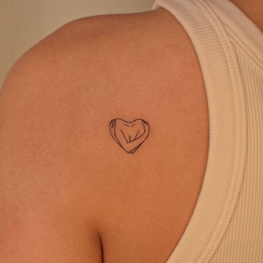 A tiny back tattoo of a woman hugging herself, the lines forming a heart — I mean, come on, that’s tender. It’s simple but carries a huge message: love yourself first, flaws and all. It feels like a daily nudge to be gentle with yourself, and honestly, who doesn’t need that reminder?