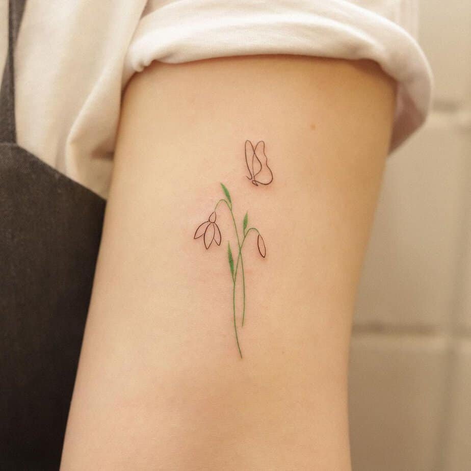 This one’s all about subtlety — a snowdrop rendered in fine lines and tiny details, with soft greens for cheer and black-and-gray to give it depth. There’s even a little butterfly, which just finishes the piece with that feminine, whimsical touch. If you want a tattoo that feels gentle and intricate, this is it.