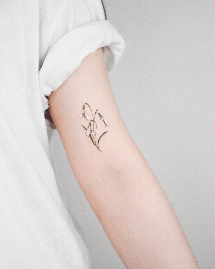 This upper-arm snowdrop leans into black-and-gray and dotwork for a statement look. It still reads as hopeful but with a confident edge — great for someone who wants symbolism and presence in one go.